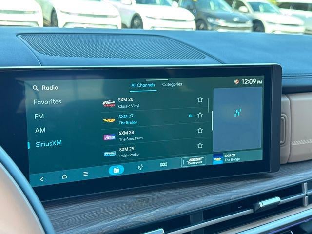 - Radio: AM/FM/HD Bose Premium Audio System -inc: 12 speakers including subwoofer, external amplifier, 12.3" wide touchscreen, Apple CarPlay and Android Auto, Bluetooth® hands-free w/wireless audio streaming, dynamic voice recognition, USB connectivity, SiriusXM, Blue Link+ connected car system, over-the-air updating capability, navigation system including traffic flow w/incident data via HD Radio (HERE) and rear seat quiet mode