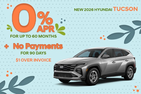 *New 2026 Hyundai Tucson gas models only. Priced at $1 over invoice. 0% APR for up to 60 months. $16.67 per month per every $1,000 borrowed. No payments for 90 days; interest accrues from date of purchase. With approved credit through Hyundai Motor Finance. Not all buyers will qualify. On select models. If provided, Advertised Price EXCLUDES all optional dealer offered items, accessories, or product addendums optionally selected by the purchaser, dealer document processing fee of $797 per TCA 55-17-114, and state and local taxes, tags, registration, and title fees. Advertised prices INCLUDE factory-installed options installed by the manufacturer and non-optional dealer-installed accessories present at time of advertising. See dealer for details. Offer expires 04/30/2026.