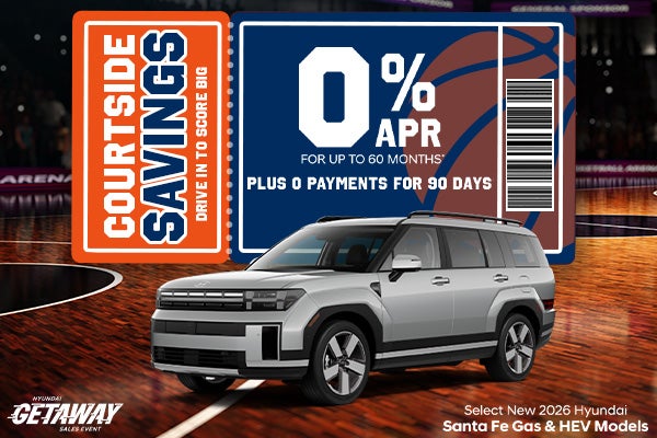 Select New 2026 Hyundai Santa Fe Gas & HEV models. 0% APR for 60 months. $16.67 per month per every $1,000 borrowed. With approved credit. Not all will qualify. Rate is dealer buydown through HMF. 90-day deferred payment program available through HMF. Interest accrues from the date of purchase. If provided, Advertised Price EXCLUDES all optional dealer offered items, accessories, or product addendums optionally selected by the purchaser, dealer document processing fee of $797 per TCA 55-17-114, and state and local taxes, tags, registration and title fees. Advertised prices INCLUDE factory-installed options installed by the manufacturer and non-optional dealer-installed accessories already installed on the vehicle by the dealer at time of advertising. See dealer for details. Offer Expires 03/31/2026.