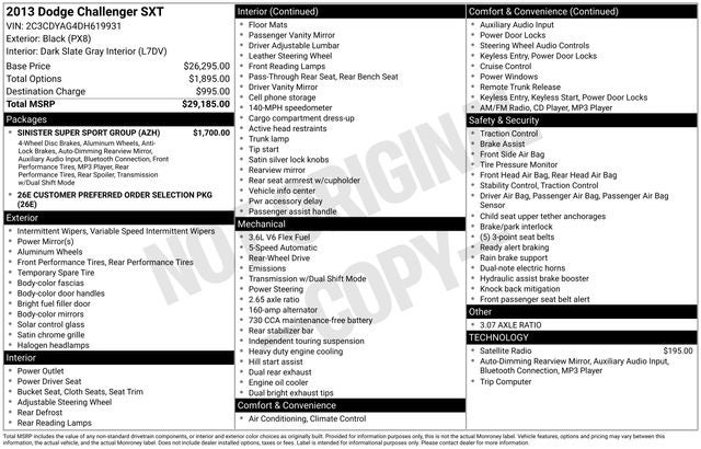 SINISTER SUPER SPORT GROUP 20 x 8.0 painted aluminum wheels, P245/45R20 all-season performance BSW tires, 3.07 axle ratio, 4-wheel anti-lock performance disc brakes, Bluetooth® streaming audio, performance steering, performance suspension, rear body-color spoiler, remote USB port, auto-dimming rearview mirror w/microphone, steering wheel mounted shift control w/sport mode, Uconnect hands-free communication, SIRIUSXM SATELLITE RADIO (1) year service, 5-SPEED AUTOMATIC TRANSMISSION (STD), 3.6L V6 VVT ENGINE (STD).