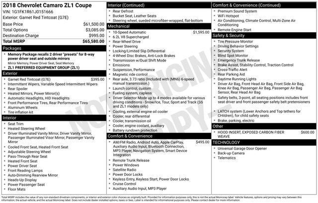 Heated Driver Seat, Cooled Driver Seat, Back-Up Camera, Premium Sound System, Satellite Radio. Chevrolet ZL1 with Garnet Red Tintcoat exterior and Jet Black with Red accents interior features a 8 Cylinder Engine with 650 HP at 6400 RPM*.