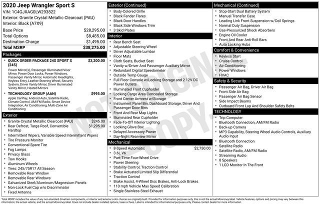 QUICK ORDER PACKAGE 24S SPORT S Engine: 3.6L V6 24V VVT UPG I w/ESS, Transmission: 8-Speed Automatic (850RE), Speed Sensitive Power Locks, Automatic Headlamps, Leather Wrapped Steering Wheel, Front 1-Touch Down Power Windows, Power Heated Mirrors, R1234YF A/C Refrigerant, Security Alarm, Remote Keyless Entry, Sun Visors w/Illuminated Vanity Mirrors, TRANSMISSION: 8-SPEED AUTOMATIC (850RE) TIP Start, Dana M200 Rear Axle, Hill Descent Control, BLACK 3-PIECE HARD TOP Freedom Panel Storage Bag, Rear Window Defroster, Rear Window Wiper/Washer, No Soft Top, TECHNOLOGY GROUP Google Android Auto®, Cluster 7.0 TFT Color Display, SiriusXM Satellite Radio, USB Host Flip, Integrated Center Stack Radio, 7.0 Touchscreen Display, Air Conditioning w/Auto Temp Control, Radio: Uconnect 4 w/7 Display, Apple CarPlay®, Air Filtering, GPS Antenna Input, ENGINE: 3.6L V6 24V VVT UPG I W/ESS (STD).