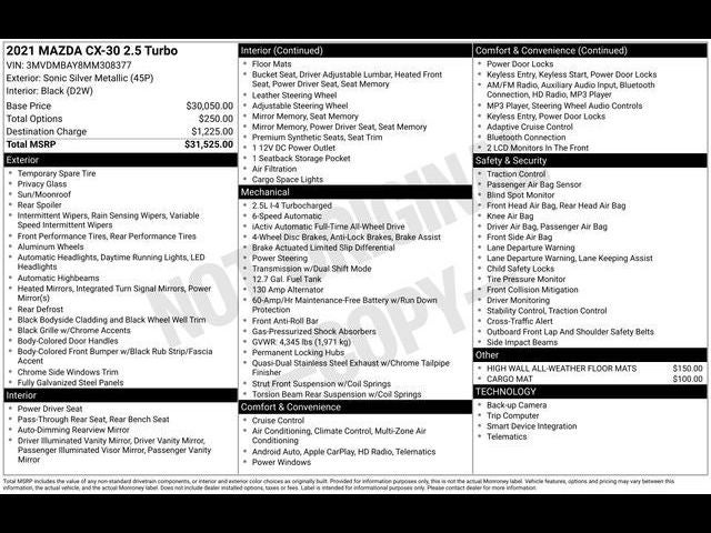 Sunroof, All Wheel Drive, Heated Driver Seat, Back-Up Camera, Turbocharged. Mazda CX-30 Turbo with Sonic Silver Metallic exterior and Black interior features a 4 Cylinder Engine with 227 HP at 5000 RPM*.