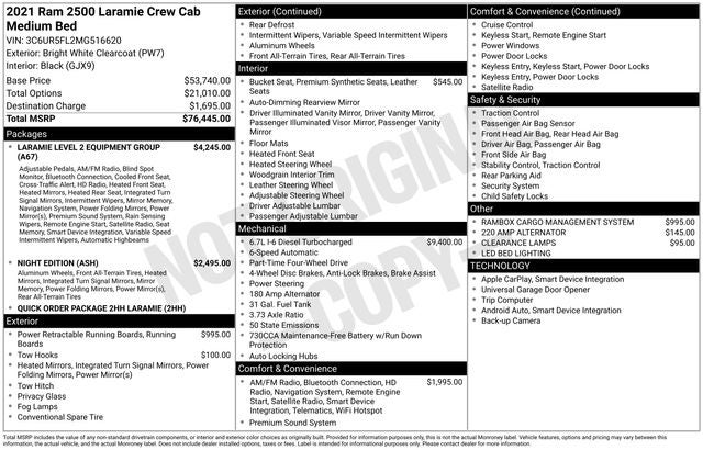ENGINE: 6.7L I6 CUMMINS TURBO DIESEL Selective Catalytic Reduction (Urea), Dual 730 Amp Maintenance Free Batteries, Cummins Turbo Diesel Badge, Heavy Duty Engine Cooling, Supplemental Heater, 220 Amp Alternator, Tow Hooks, Diesel Exhaust Brake, Front Bumper Sight Shields, Capless Fuel Fill w/o Discriminator, LARAMIE LEVEL 2 EQUIPMENT GROUP Blind Spot & Cross Path Detection (DISC), Power Chrome Tow Mirrors w/Convex Spotter & Memory, Mirror-Mounted Aux Reverse Lamps, Exterior Mirrors w/Memory, Power Adjustable Convex Aux Mirrors, Rain Sensitive Windshield Wipers, Power Adjustable Pedals w/Memory, Radio: Uconnect 4C Nav w/8.4 Display, Ventilated Front Seats, Remote Tailgate Release, 17 Speaker harman/kardon Premium Sound, Auto High Beam Headlamp Control, Heated Second Row Seats, Foam Bottle Insert (Door Trim Panel), 2nd Row In Floor Storage Bins, Radio/Driver Seat/Mirrors/Pedals Memory, NIGHT EDITION Mirror-Mounted Aux Reverse Lamps, Black Ram Head Tailgate Badge, Wheels: 20 x 8.0 Black Painted Aluminum, Black Wheel Center Hub, Black Headlamp Bezels, Body Color Door Handles, Painted Front Bumper, Painted Rear Bumper, Tires: LT285/60R20E OWL On/Off Road, Black Exterior Truck Badging, Exterior Mirrors w/Memory, Gloss Black Grille Billets/Accents, Body Color Grille Surround, Black Interior Accents, Black Exterior Mirrors, Black Tail Lamp Bezels, Power Black Tow Mirrors w/Convex Spotter & Memory, Power Adjustable Convex Aux Mirrors, RADIO: UCONNECT 12.0 W/NAVIGATION SiriusXM Traffic Plus, Disassociated Touchscreen Display, HD Radio, For Details Visit DriveUconnect.com, 1-Year SiriusXM Guardian Trial, 12 Touchscreen Display, GPS Navigation, SiriusXM Travel Link, 4G LTE Wi-Fi Hot Spot, SiriusXM w/360L, POWER DEPLOYABLE RUNNING BOARDS, TRANSMISSION: 6-SPEED AUTOMATIC (68RFE) Chrome Accent Shift Control.