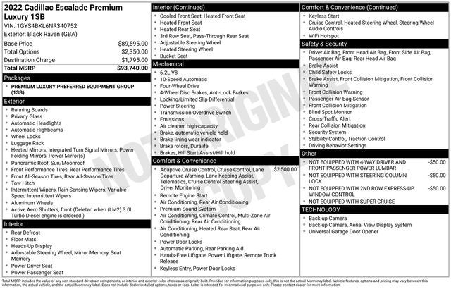 SUPER CRUISE a hands-free driver assistance system for use on compatible roads (Vehicles built between October, 2021 and December 5, 2021, will be forced to have (00U) Not Equipped with Super Cruise, which removes Super Cruise and its content. Beginning with production starting December 6, 2021, (UKL) Super Cruise will be forced on as standard content. Beginning with production starting May 9, 2022, vehicles will be forced to include (00U) Not Equipped with Super Cruise, which removes Super Cruise and its content. See dealer for details or the window label for the features on a specific vehicle. Always pay attention while driving and when using Super Cruise. Do not use a hand-held device. Visit cadillac.com/supercruise for compatible roads and full details.), OLED INFOTAINMENT EXPERIENCE WITH NAVIGATION AM/FM/SiriusXM with 360L with 16.9 diagonal color information display (displays and controls navigation, music and all features and functions of the vehicle), personalized profiles for each drivers settings, Natural Voice Recognition, Phone Integration for Wireless Apple CarPlay®/Wireless Android Auto® capability for compatible phone, Connected Apps and Teen Driver (STD), ENGINE, 6.2L V8 WITH DYNAMIC FUEL MANAGEMENT Direct Injection and Variable Valve Timing, includes aluminum block construction (420 hp [313.2 kW] @ 5600 rpm, 460 lb-ft of torque [623.7 Nm] @ 4100 rpm) (STD), TRANSMISSION, 10-SPEED AUTOMATIC electronically controlled with overdrive, tow/haul mode and tap up/tap down shifting (STD).