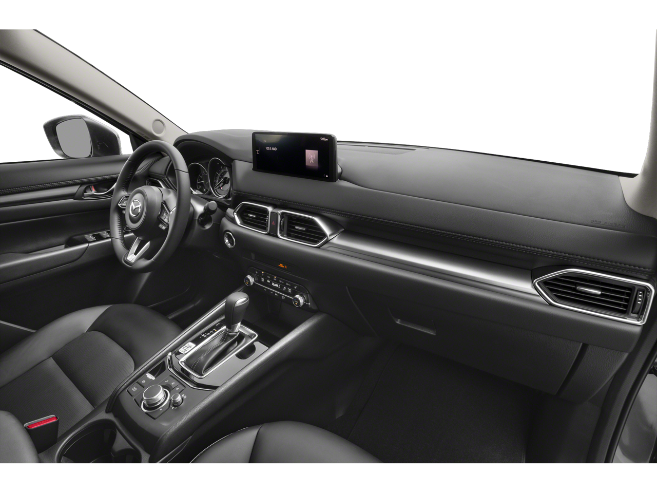 Inside, the CX-5 is loaded with a wealth of premium features, including an advanced infotainment system with voice command, Apple CarPlay and Android Auto integration, and a premium audio system. The dual-zone automatic climate control, heated front seats, and leather-wrapped steering wheel and shift knob add to the vehicle's luxurious feel.